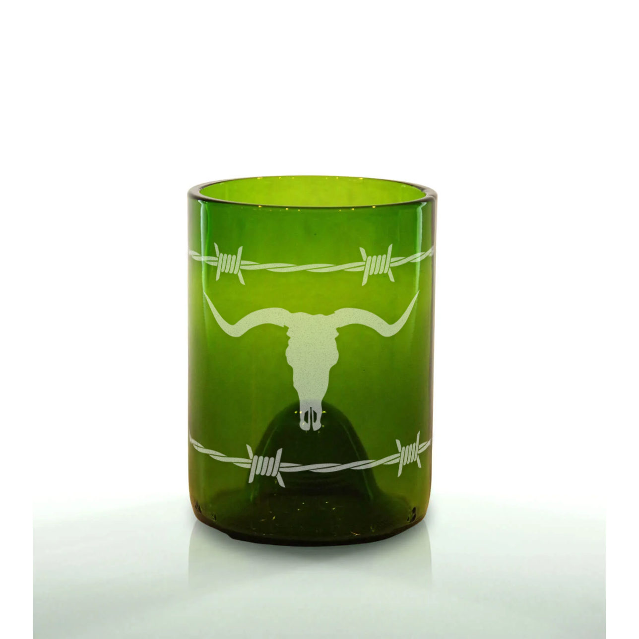 Wet your whistle with these Barbwire upcycled glasses—they're the real deal: handmade in Texas, eco-friendly, and stunningly beautiful! Repurposed wine and Topo Chico bottles are rescued and collected by the community, known as the "bottle brigade". They then embark on their journey through our upcycling process where they are fire-polished, heated, and cooled to create a smooth, dishwasher-safe, durable finish, and engraved with a design meaningful to you. Choose from our standard engravings or create your own to make every drink, from sparkling water to whiskey, a reason to celebrate. Thank you for helping us in our vision to create something real out of emptiness.