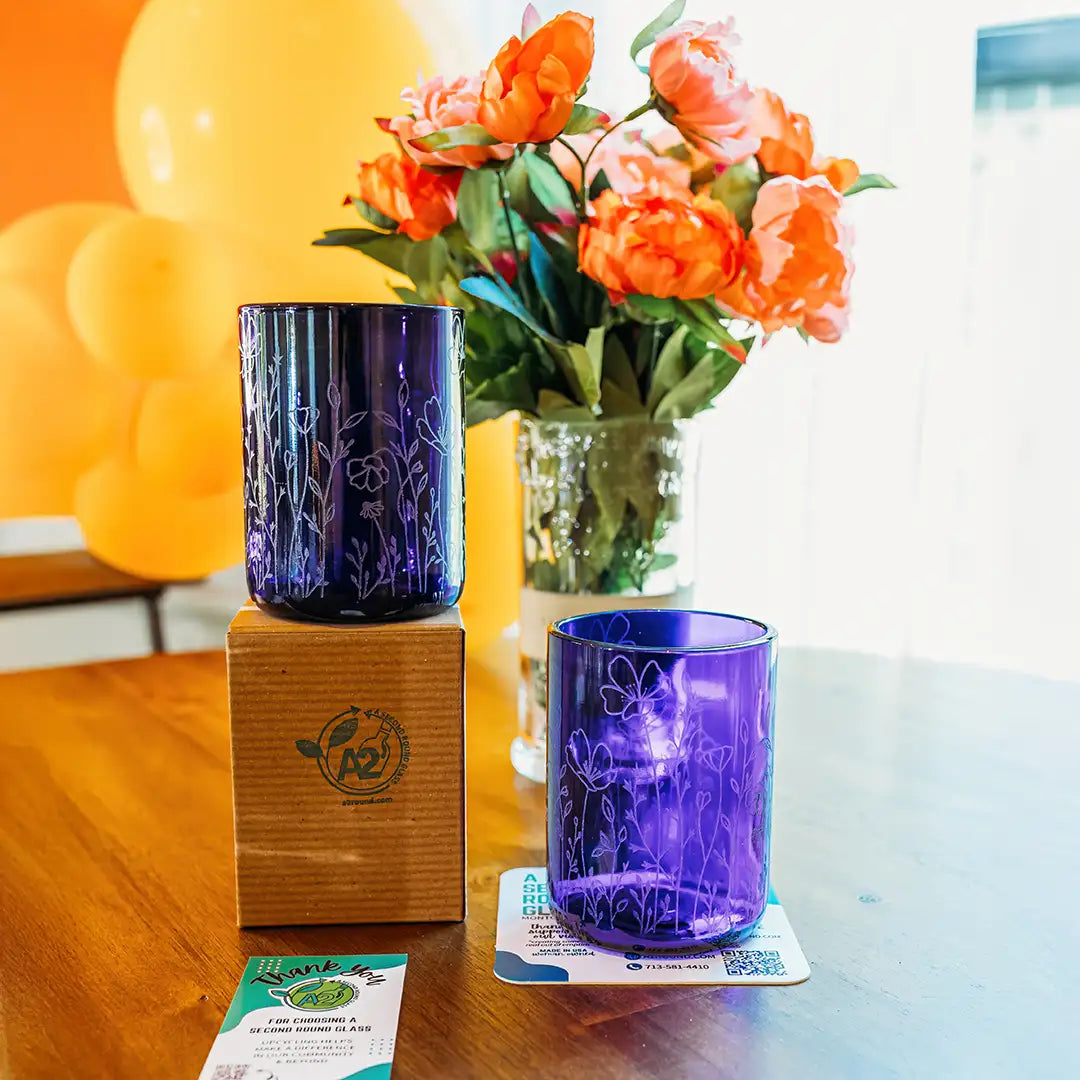 From our classic laser-engraved glasses to our more detailed wrapped designs, every piece starts the same way in our Texas studio. We take post-consumer bottles and turn them into one-of-a-kind drinkware you’ll reach for every day.